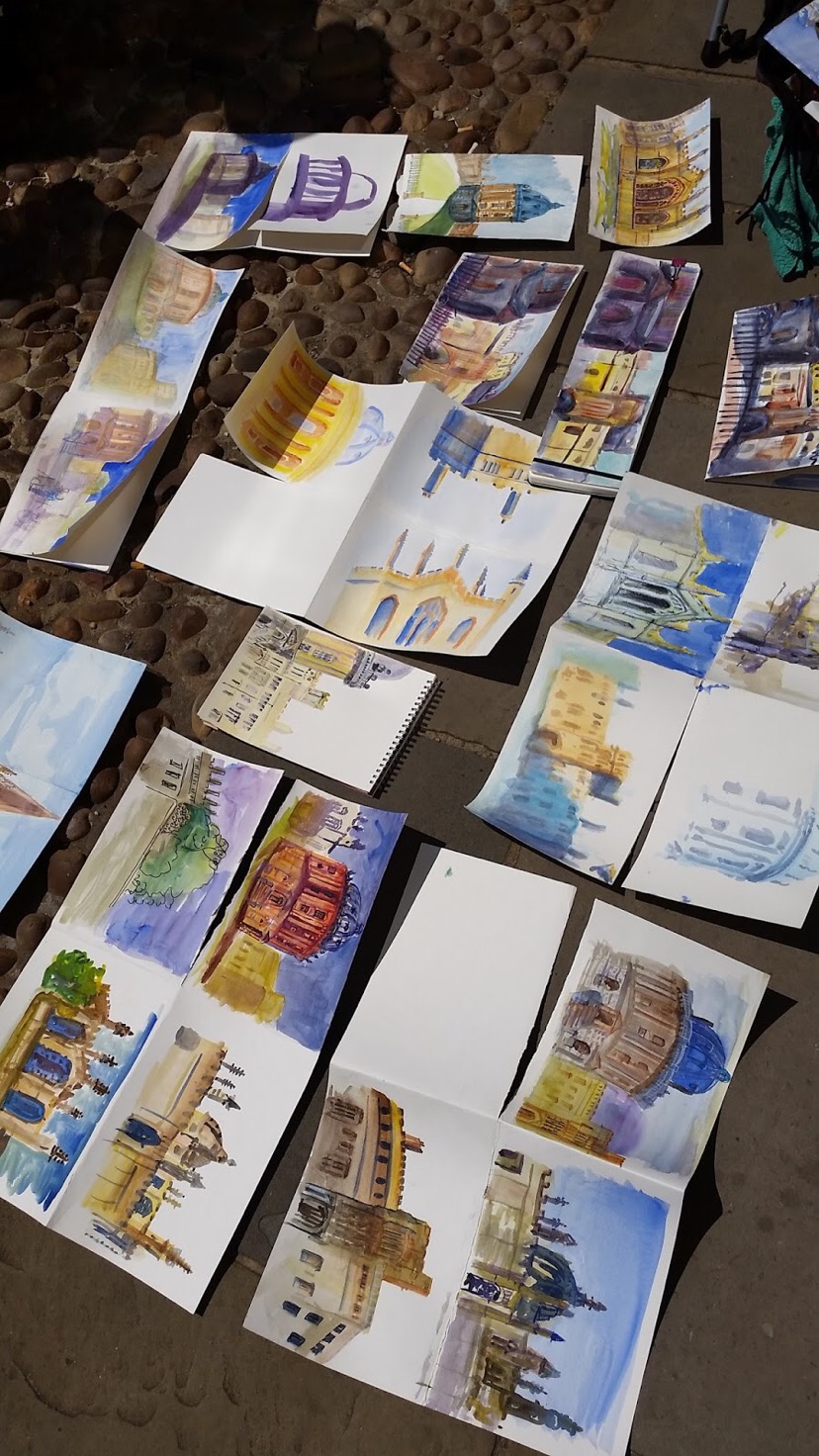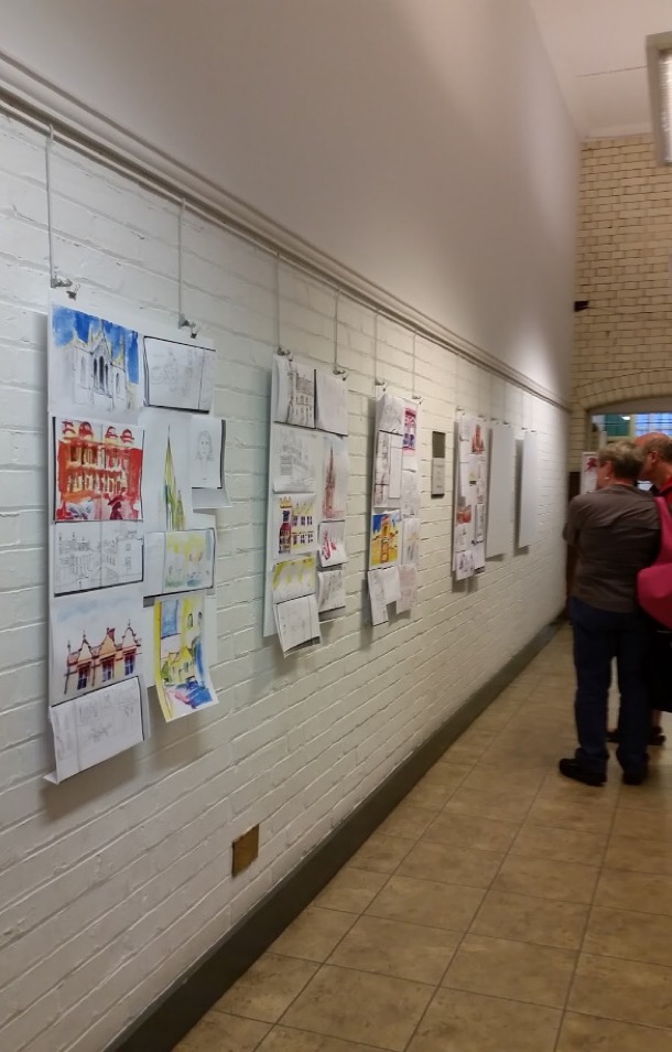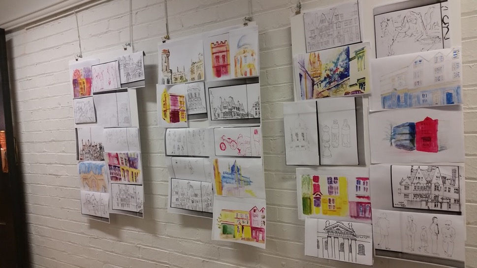 This was our second workshop in Oxford where we combined our skills to provide a great variety of insight on the breadth of urban sketching, Swasky focused on people, Isabel on colour and Miguel on line. This year we had our base at the Museum of Oxford within the Town Hall complex right in the centre of Oxford. Not only did we meet there at the beginning of each session but we put together an exhibition from with the tutors and students work that was displayed in their gallery space during July 2015