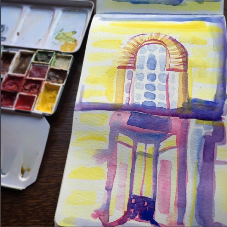 Isabel worked in watercolour: She asked participants to look at colour first, lose the fear of doing it wrong, think about contrast and look at colour in relation of light and shadow and not colouring in or paint a “pretty” picture – e.g. one of the exercises restricted the colour palette to one colour and its complementary, and/or primary colours.