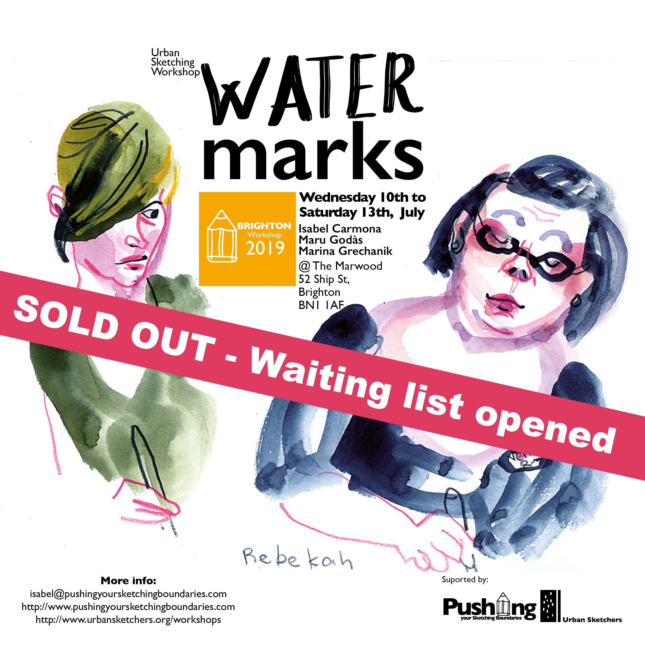 Three day workshop in Brighton called Watermarks on the subject of urban sketching on water based media with Isabel Carmona, Maru Godas and Marina Grechanik. Full price ticket.