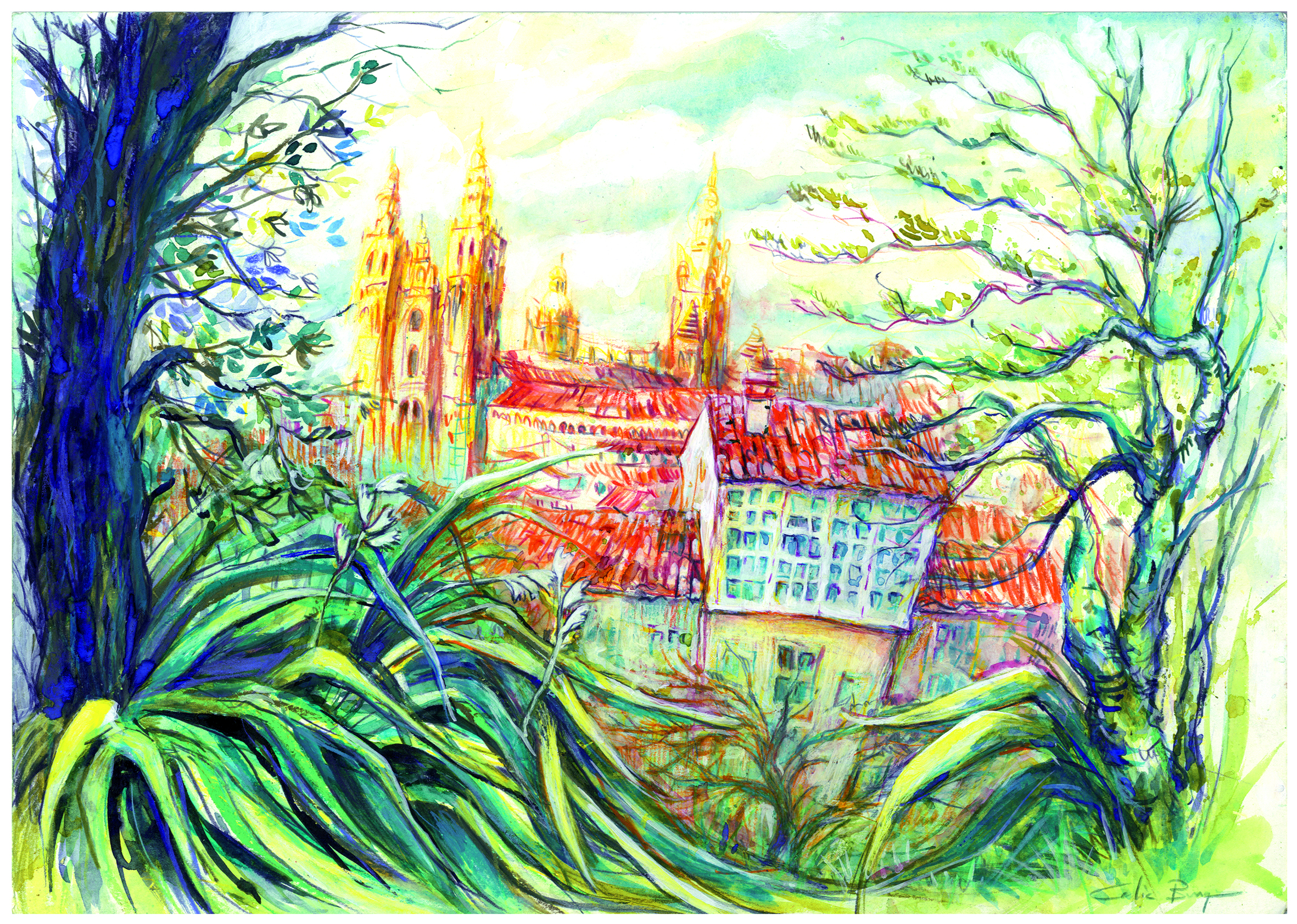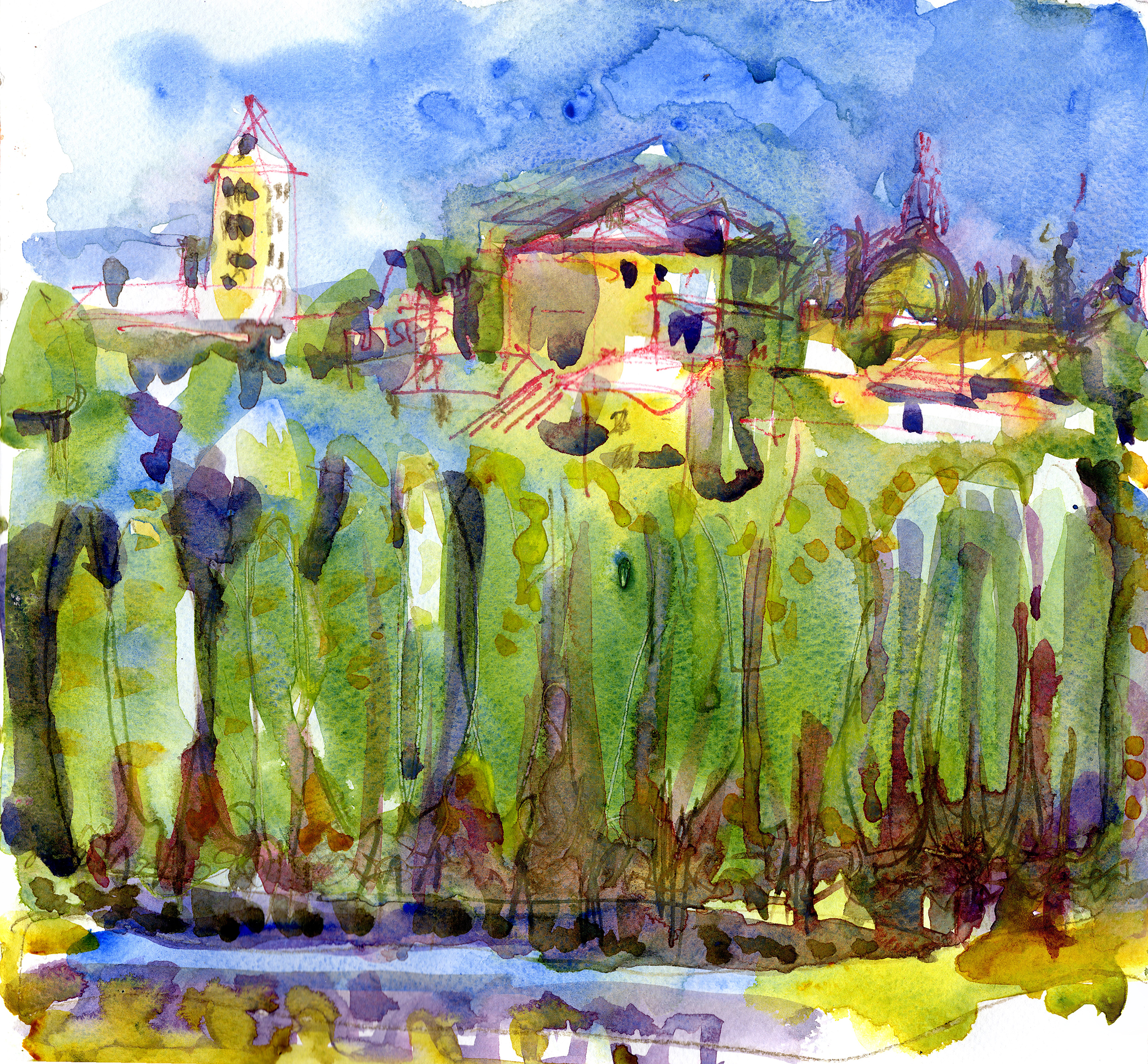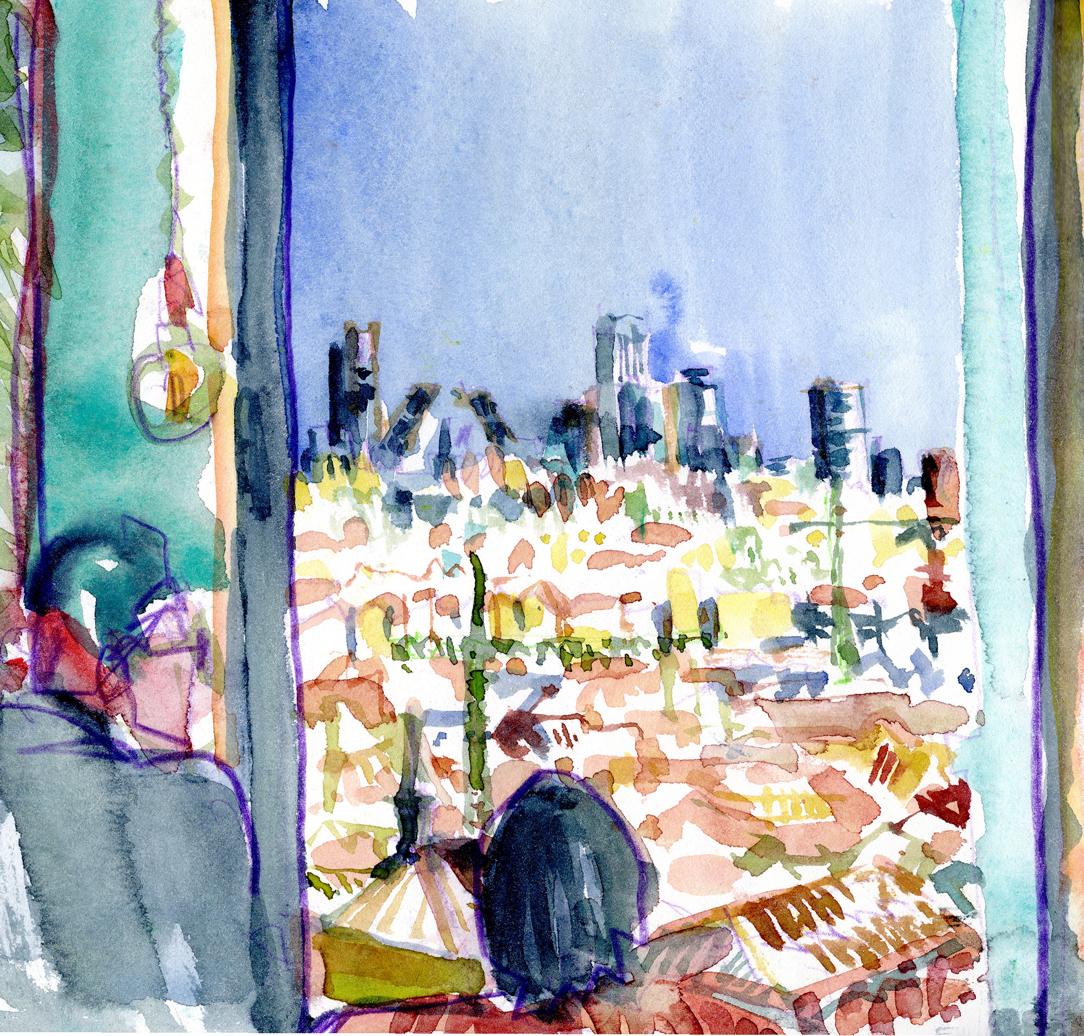 In this workshop we will first look at the city from the distance, from a vantage point, looking at panoramic views and how to focus the view on what interests us, bringing it closer to us while highlighting key landmarks. We will work with watercolours which is well suited to give us layers that dissolve in the distance.