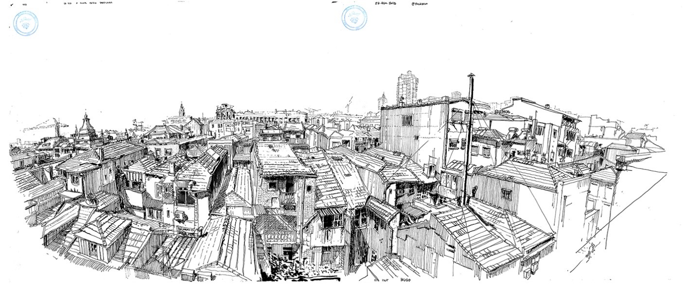 We usually represent the space looking right, which is very limited compared to what we are observing and feeling while being in a place, turning the head, and looking up and down. When we are in a narrow street, next to tall buildings or go up to a rooftop we feel the space in a way that should not be limited with conventional vertical lines, defined by one or two vanishing point perspective. If you forget those Renaissance rules, instinctively verticals start to bend and lines to curve.