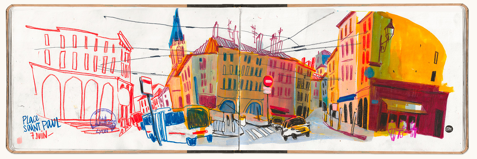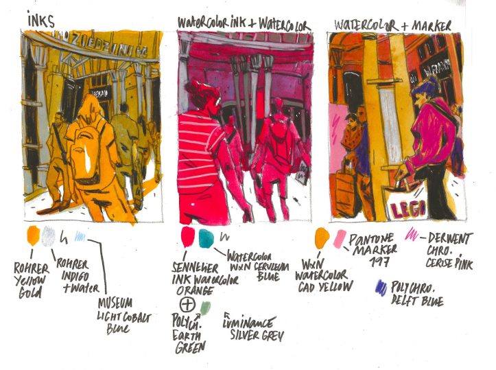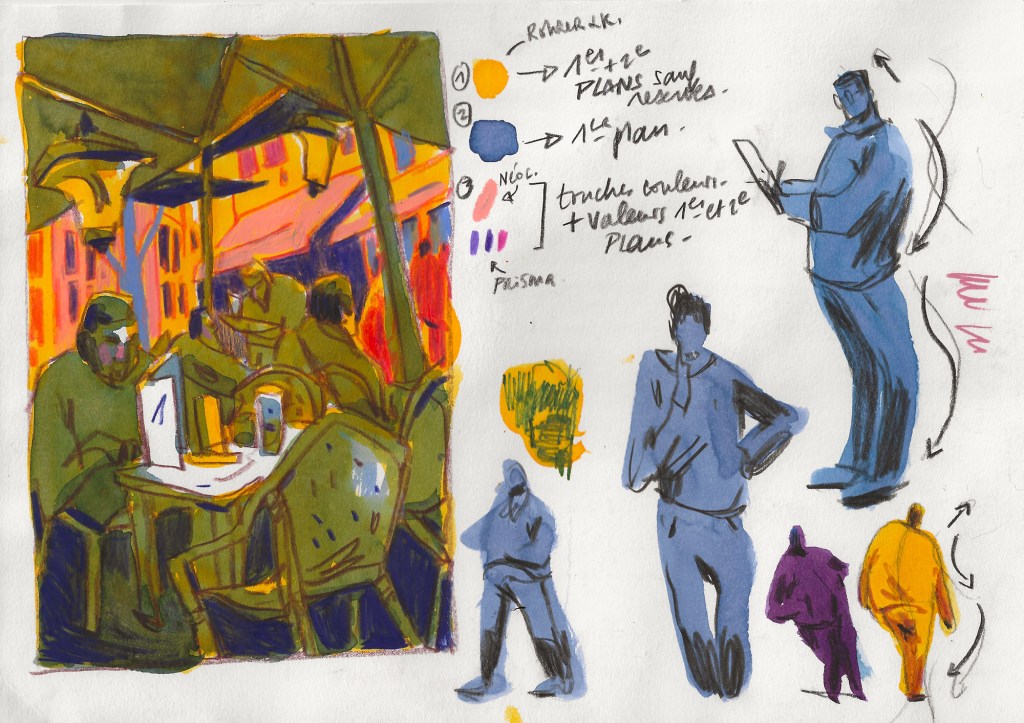 In the second session, we’ll scale up to larger scenes, applying the same principles with more freedom. Colour becomes the main actor: it sets the atmosphere, guides the eye, and enhances the layers and textures. Participants will experiment with mixing media to build expressive, dynamic sketches where colour and texture pop and tell the story.